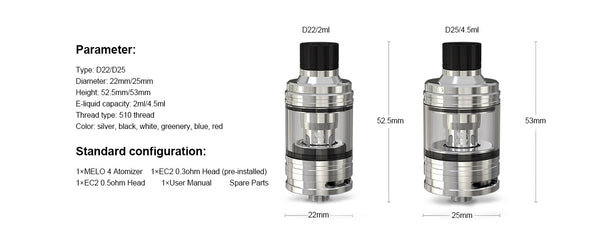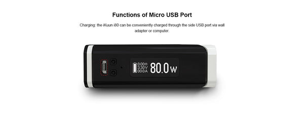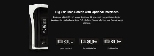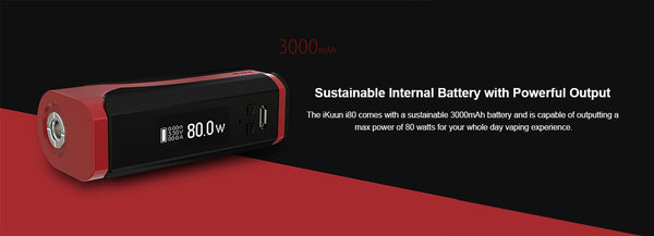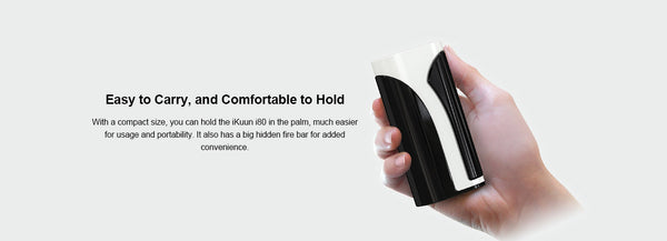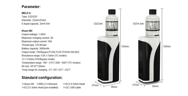 Eleaf iKuun i80 is a compact box mod with built-in battery, featuring maximum 80W output power, big 0.91-inch screen and VW/TC(Ni/Ti/SS)/ TCR(M1/M2/M3) modes. It also supports firmware upgrading and USB charging. The latest Melo 4 tank atomizer adopts new EC2 coil and delivers an impressive vaping experience. You can choose 2ml D22 and 4.5ml D25 atomizers according to your own taste. 6 colors.