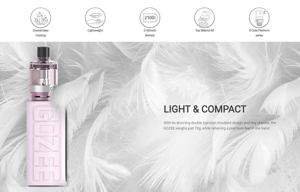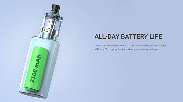 Innokin GoZee Kit is bundled with a 24mm GO Z+ tank, powered by a 2100mAh integrated battery and utilizing max 60W output. Constructed from PC and ABS, it maintains a lightweight and compact design. Depending on its GoZee chip, it supports VW/Power mode and can adjust the wattage range from 6W to 60W, which performs well between MTL and RDL vaping. It boasts a gigantic 2100mAh battery and features a 510 thread to connect the GO Z+ tank. It holds up to 3.5ml e-juice and is refillable from its slider-top cap. Compatible with all Zenith / Z coils, incorporating AFC, it delivers more vapor.