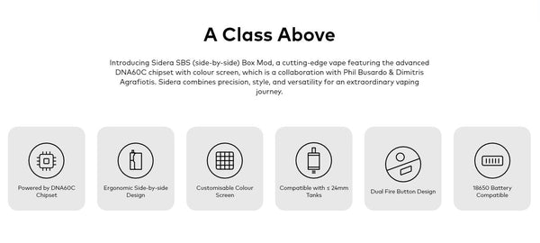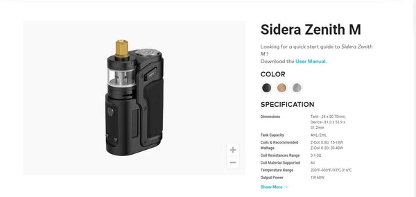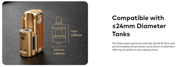 The Sidera DNA 60C runs on an 18650 battery and can deliver up to 60W of power. It can accommodate atomizers up to 24mm in diameter. There were three colors...