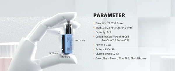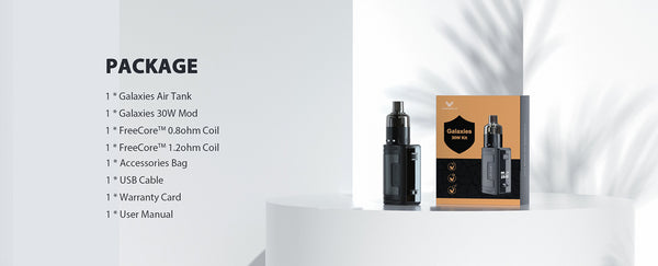 Galaxies 30W Kit comprises of Vapefly Galaxies 30W Mod and Galaxies Air Tank. Vapefly Galaxies 30W Kit is the smallest rugged mod kit, provides shockproof, dustproof and waterproof. Vapefly Galaxies 30W Mod features built-in 950mAh battery with 30W max output, it would provide a whole day vaping experience. Vapefly Galaxies Air Tank has 2ml e-juice capacity and adopts side filling method. The adjustable bottom airflow is suitable for MTL/DL vaping. Galaxies Air Tank is compatible with all Vapefly FreeCore G Series Coil for rich flavor and strong throat-hit.