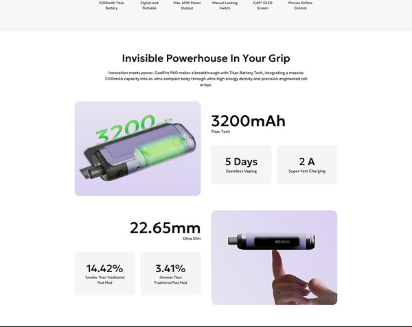 The Innokin Coolfire P60 combines a sleek form with long-lasting performance, powered by a robust 3200mAh built-in battery and capable of up to 60W output. Designed for everyday portability, it features a compact pod mod structure with a 4ml e-liquid capacity, making it suitable for both MTL and RDL vaping. With three pod options (0.4ohm / 0.6ohm/ 0.8ohm), precise airflow control, and a responsive 0.69" OLED screen, the Coolfire P60 delivers a customizable and satisfying vape. A manual locking switch enhances safety, while USB-C 5V/2A charging ensures quick and reliable power. The exterior is finished with leather accents, enhancing both the grip and the premium hand feel.