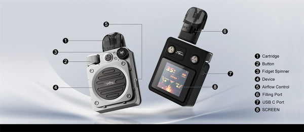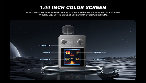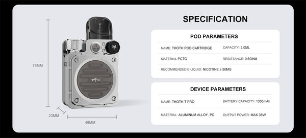Introducing the new THOTH T Pro pod system by Kumiho, an upgrade from the original THOTH T design. Featuring a large 1.44 inch color screen that displays all your vaping data, it enhances your vaping experience with animated visuals across three modes: ECO, Normal, and Super. Powered by a robust 1300mAh battery, it ensures seamless vaping throughout the day. Compatible with the entire THOTH series pod cartridges and coils, alongside a precise adjustable airflow system, it delivers a comprehensive vaping experience from RDL to MTL styles.