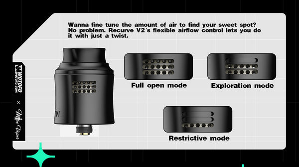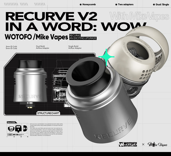 Introducing the Wotofo newest collaboration with Mike Vape--the Recurve V2 RDA an exciting upgrade of the once popular Recurve and has a diameter of 24.6mm, 35.55mm Height with the drip...