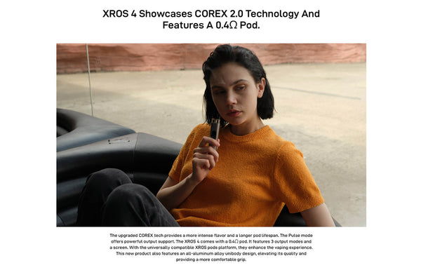 The Xros 4 is The New Best Pod In Xros Family, perfect Choice For Taste And Consistency From Tight MTL To Rdl Experience. Cross The Limits Of MTL & RDL With The New 0.6ohm Pod And Pulse Mode By Axon Chip, Also Compatible With All Xros Pods. Cross The Limits of Strong Flavor With The Corex Heating Tech, Cross The Limits Of Design And Reliability By Upgraded Mouthpiece And Neon Battery Indicator.