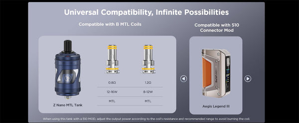 The Geekvape Z MTL Tank is meticulously engineered for mouth-to-lung (MTL) enthusiasts, offering a precise and satisfying vaping experience. Featuring a top-to-bottom airflow system and the industry-leading Z-level leakproof design, this tank ensures zero leakage and optimal flavor delivery. Its stylish hollow-carved "Z" design not only adds aesthetic appeal but also provides a clear view of the e-liquid level. Constructed with a durable metallic shell, the tank offers enhanced protection against breakage. compatibility with replaceable 510 drip tips for customization, and a universal 510 connector for broad device compatibility, Compatible with Geekvape's B MTL Series Coils, the Z MTL Tank delivers dense flavor and a satisfying throat hit, making it an ideal choice for MTL vaping aficionados.