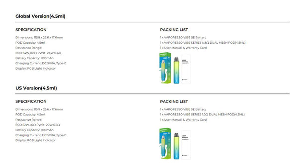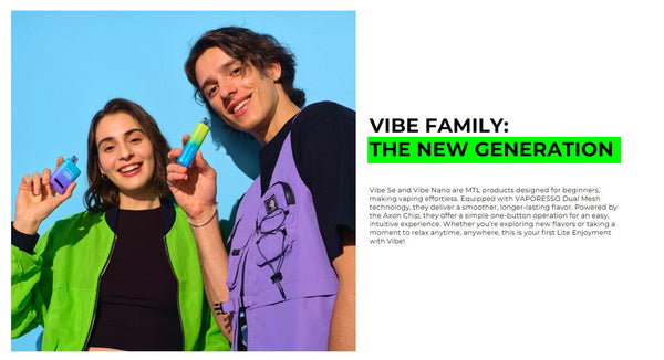 VIBE SE & Vibe Nano Pod Designed for MTL beginners, this duo combines simplicity with advanced performance. Powered by the Axon Chip, both devices feature one-button operation and VAPORESSO's Dual Mesh technology (0.8ohm ECO mode at 14W for flavor exploration; 0.6ohm PWR mode at 24W for instant satisfaction), delivering ultra-smooth, enduring taste even for veteran vapers. The 1100mAh battery supports all-day use, recharged swiftly via Type-C (5V/1A). A 4.5ml leak-resistant pod minimizes refills, while the RGB light indicator simplifies power monitoring.it's your pocket-sized gateway to hassle-free vaping.