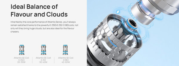 Coil compatibility: Atlantis SE Coil 0.35ohm (20-30W)/ Atlantis SE coil 0.3ohm (30-40W) / Atlantis SE coil 0.18ohm (45-60W)