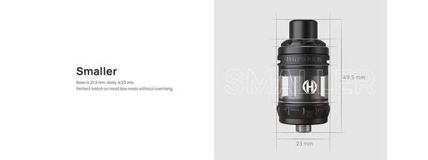 The Huracan Mini is a mini-sized Huracan version. The top-to-bottom airflow system creates a massive vapor and rich flavor while preserving its anti-leak protection element. Featuring a screw-to-open top fill system with proper e-juice capacity and optional BP coils for strong throat-hit with huge clouds. Thread-less press-fit coil change system for quick access coil replacement. Combination of 2ml / 3ml e-liquid capacity and a convenient top fill provide the best user experience. The base is 21.5mm, the body is 23mm, perfect match on most box mods without overhang.
