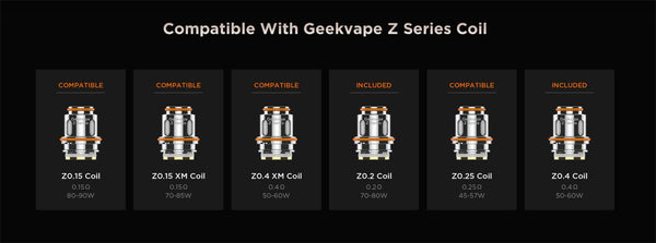2pc Geekvape Z Series coil (Pre-installed: Z 0.2ohm, 70-80W; Spare Coil: Z0.4XM - 0.4ohm, 50-60W)