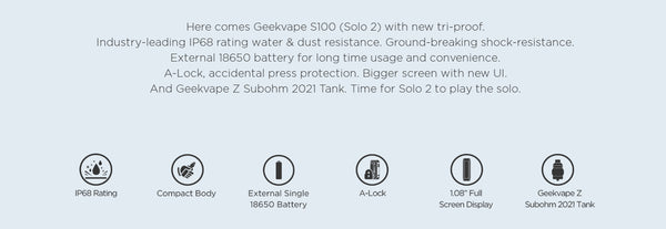 Geekvape S100 (Aegis Solo 2) Kit with Z Subohm 2021 Tank Tri-proof Tech to provide you with more effective waterproof, dust-proof, and shock-proof protection. Industry-leading IP68 rating water & dust resistance. Ground-breaking shock-resistance. External 18650 battery for long time usage and convenience. A-Lock, accidental press protection. Bigger screen with new UI. And Geekvape Z Subohm 2021 Tank. Time for Solo 2 to play the solo.