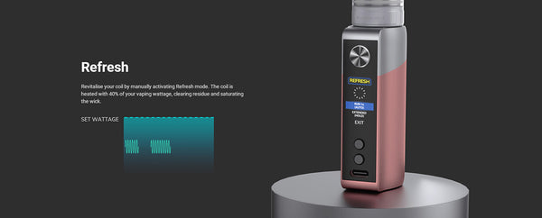 Coil+ mode will automatically pulse your coil after each vape, effectively clearing residue and drawing e-liquid to the coil in readiness for your next draw. Refresh will revitalize your coil by heating it to 40% of your set vaping wattage to help saturate your wick.