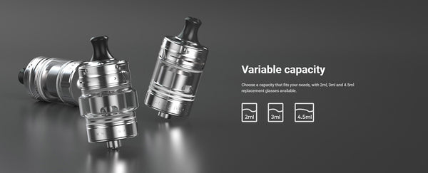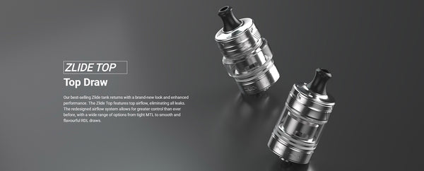 Coupled with the Coolfire Z60 is the newly updated Zlide Top Tank. It’s a slide to open top fill with adjustable single slot top airflow. It holds a maximum of 4.5ml (2ml EU version) with the option of purchasing a 3ml glass if preferred.