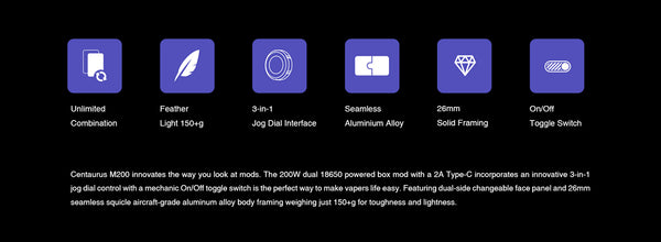 The Centaurus M200 innovates the way you look at mods . The 200W dual 18650 powered box mod with a 2A Type-c incorporates an innovative 3-in-1 jog dial control with a mechanic On / Off toggle switch is the perfect way to make vapers life easy . Featuring dual-side changeable face panel and 26mm seamless squicle aircraft-grade aluminum alloy body framing weighing just 150 + g for toughness and lightness .