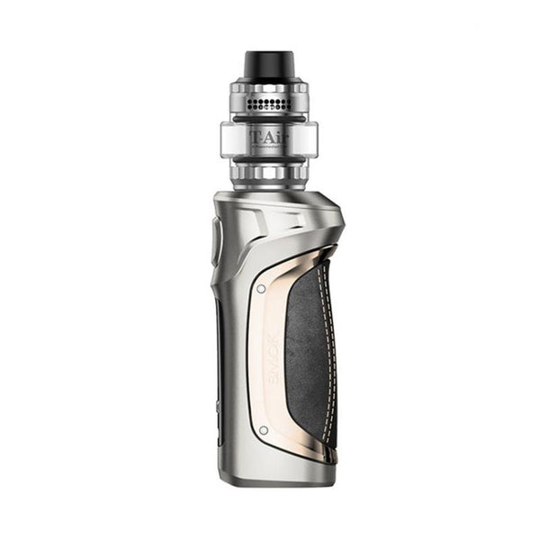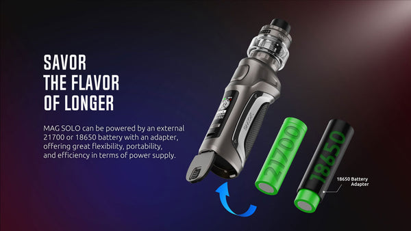 Smok Mag Solo Vape Kit is powered by single 18650/20700/21700 battery(not included),5-100W output range,utilizes a 0.96" TFT display and is button-activated, the leather decoration at the side helps ergonomic hold. The box mod has 32.2mm across the area.The Smok Mag Solo is compatible with 5ml T-Air tank, and has dense vapor production via TA Series meshed coils.The T-Air tank measures 30mm in diameter. Accommodating 5ml of freebase and nic salts, it purchases huge clouds via both honeycomb airflow and the TA meshed coil.