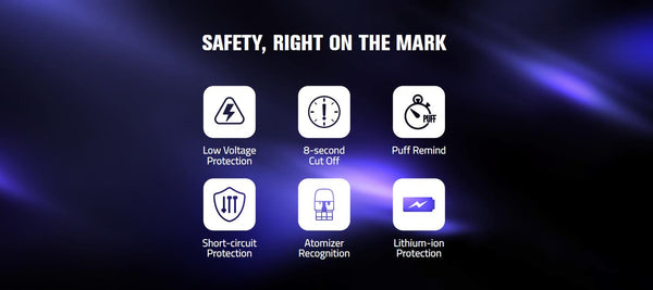 8. Comprehensive safety protections: atomizer recognition, low voltage, short circuit, 8s cut-off, and lithium-ion safeguards.