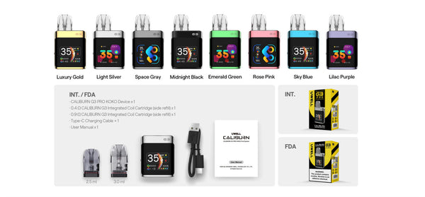 The Uwell Caliburn G3 Pro KOKO Pod System Kit is Features Cobining a dynamic Ul, adjustable power, and fine-tuned airflow control, the CALBURN G3 PRO KOKO is truly a powerhouse of a vape. Designed to meet the demands of top performance seekers, it boasts a monster 1.8inch TFT display for a stunning Visual experience,a pro battery of 1250 mah that stands out among its peers, and unlimited customizability to let you define your own vaping modes. Featuring a 3ml-0.4ohm cartridge and a maximum output of 35W , the CALIBURN G3 PRO KOKO gives you a robust RDL vape experience. With a metallic finish that exudes luxury and 8 tasteful colors to express your individuality, you can join the KOKO family in style!