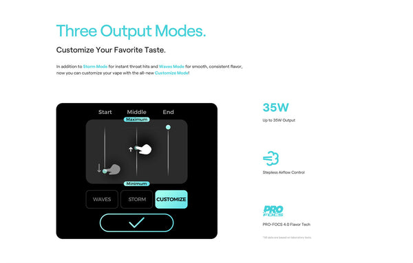4. Three Output Modes – Storm Mode for instant throat hit, Waves Mode for smooth flavor, Custom Mode for tailored performance.